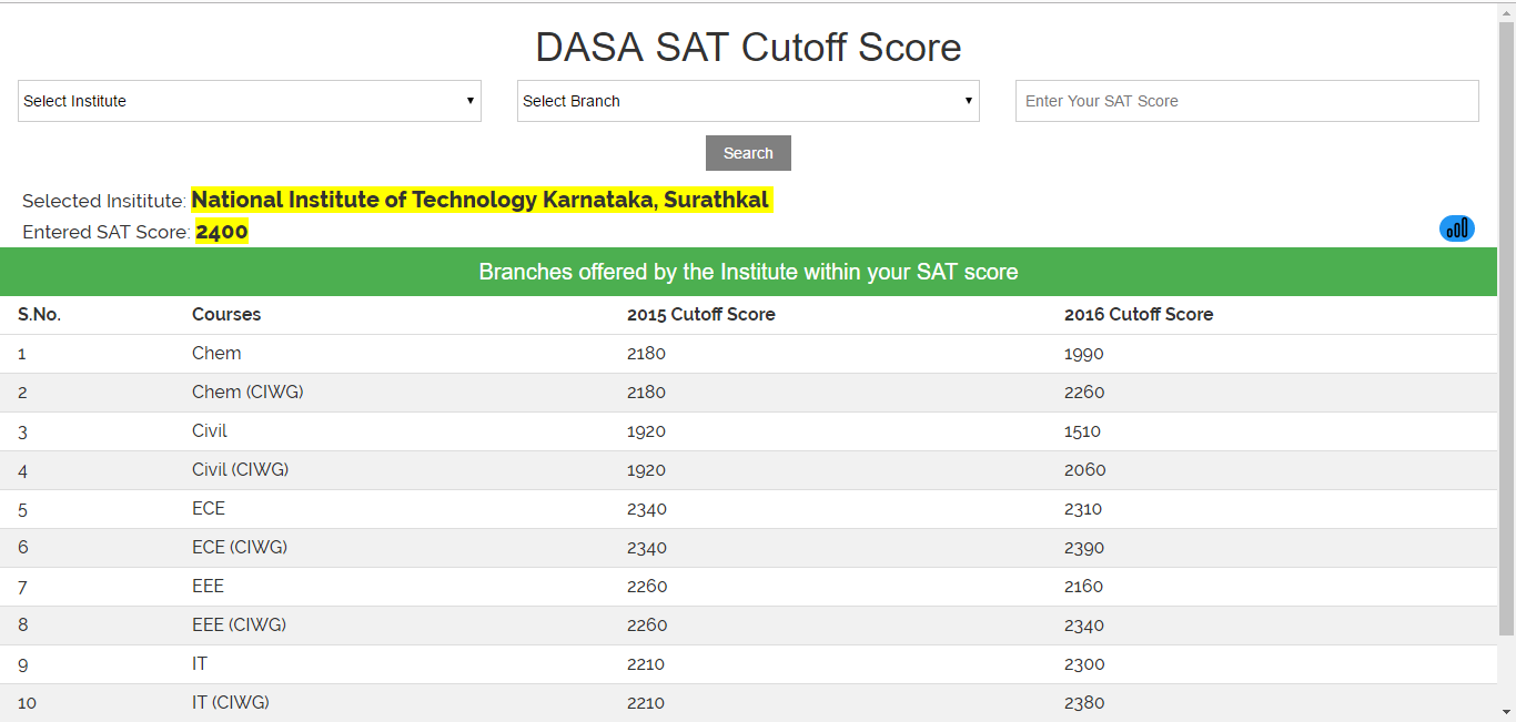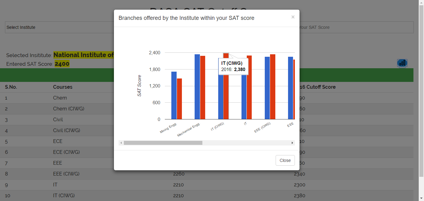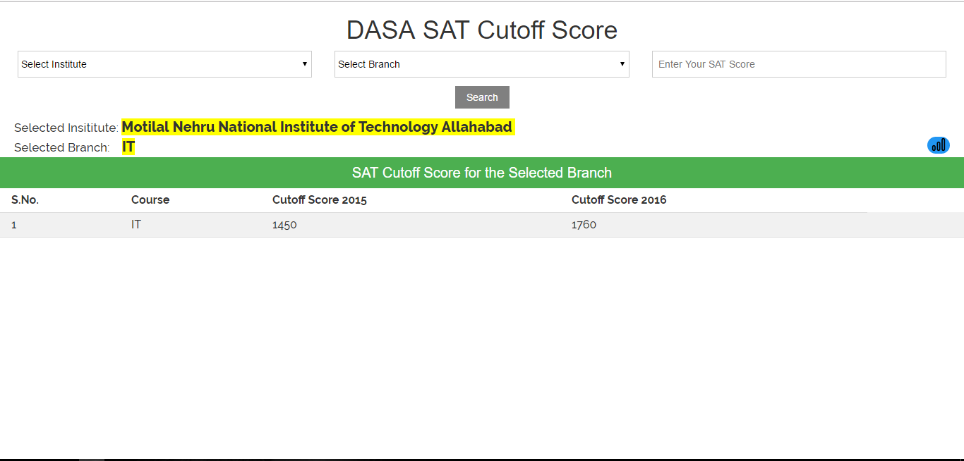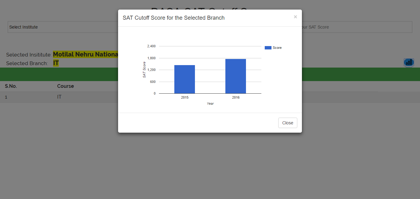 Output : All the Institutes offering the selected course within the entered SAT Score