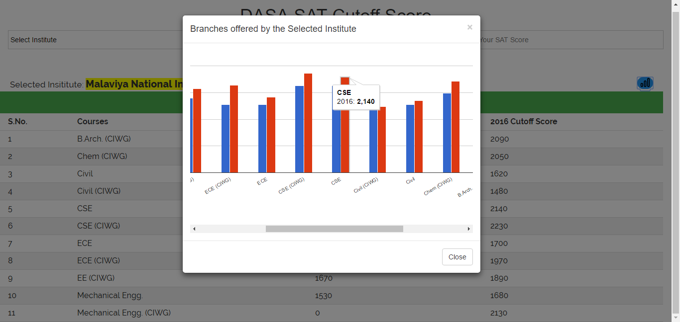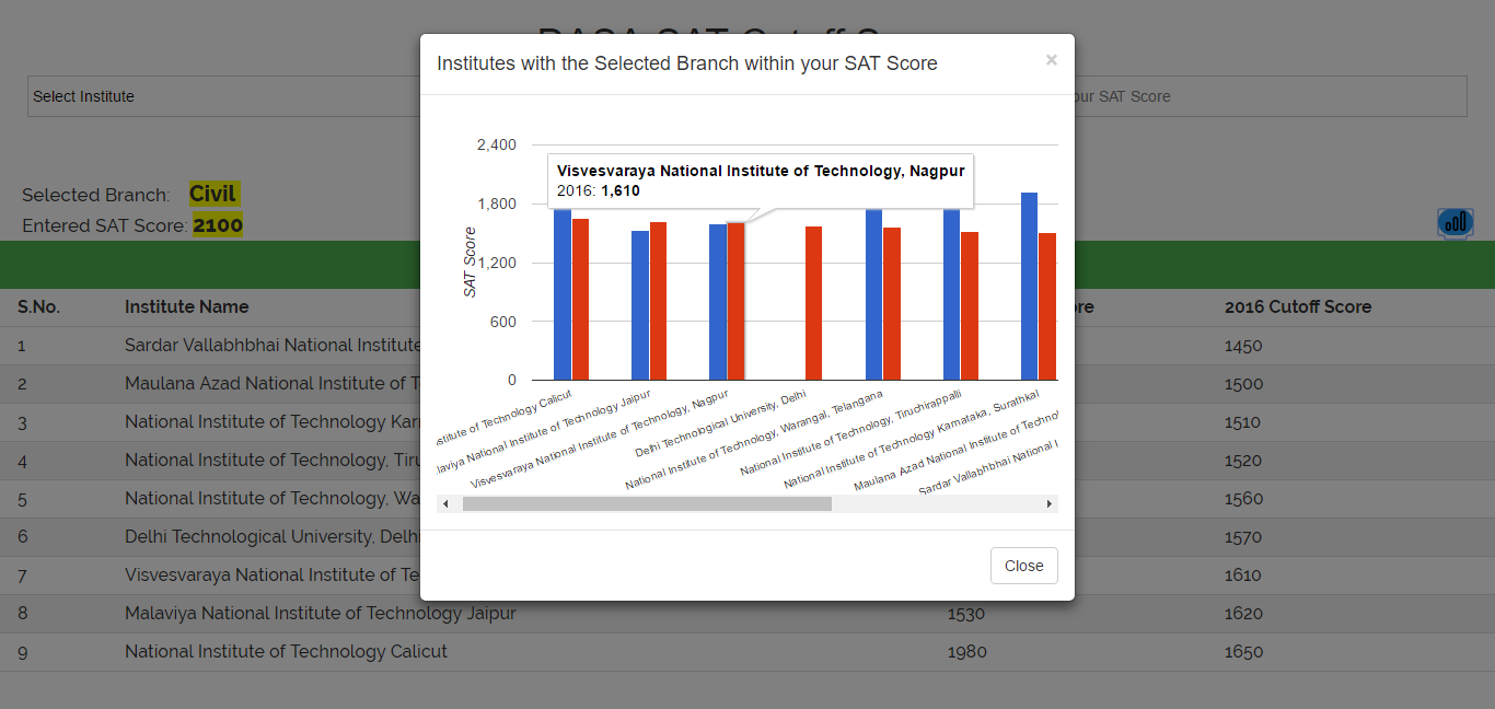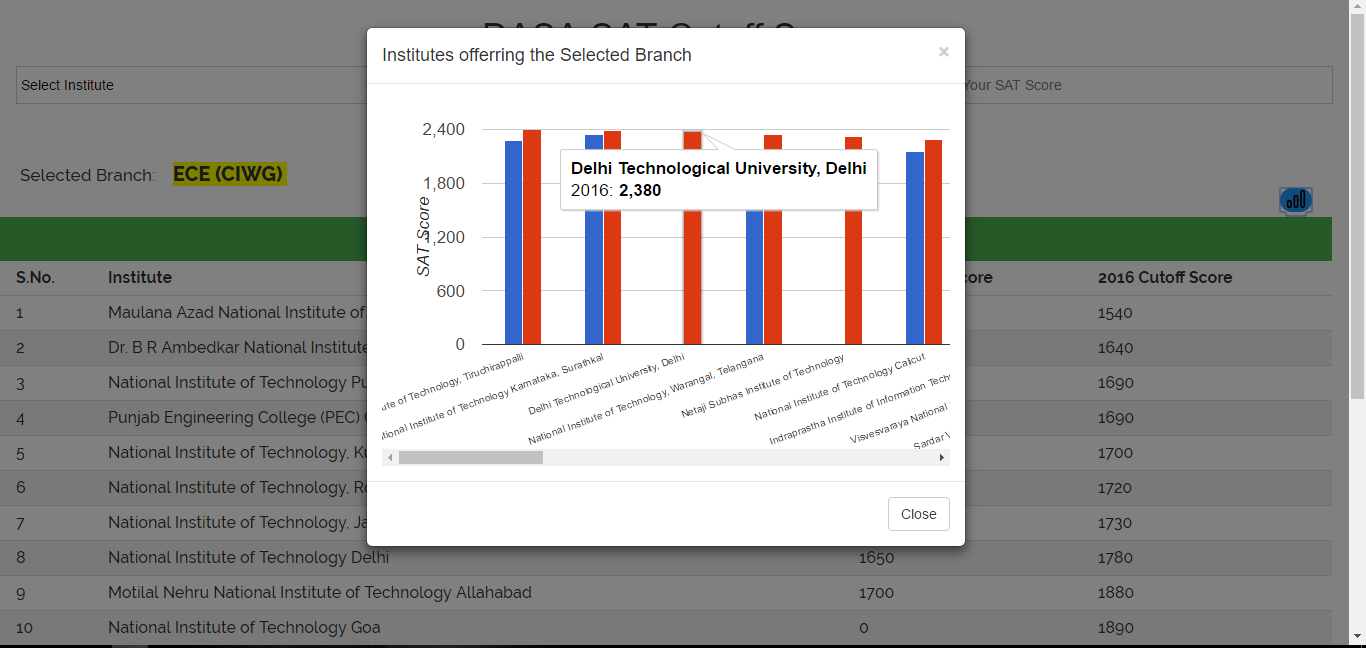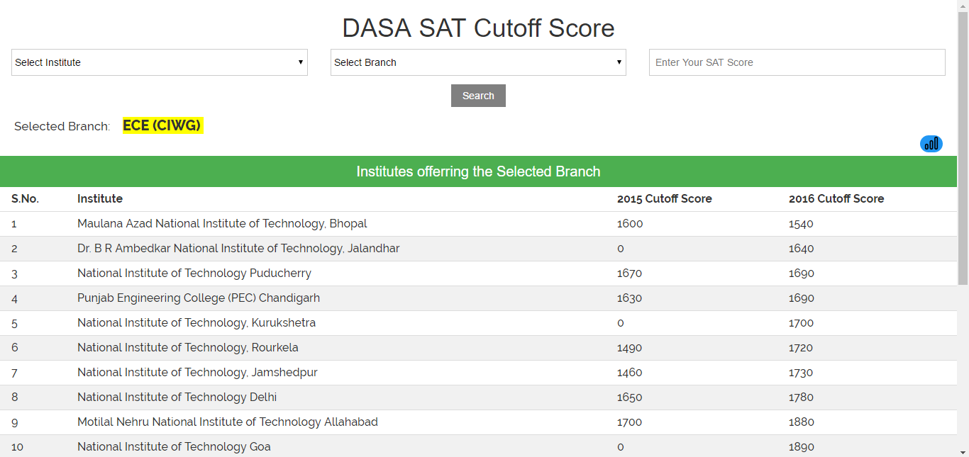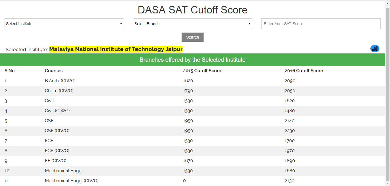 Output : All the Institutes offering the selected course within the entered SAT Score
